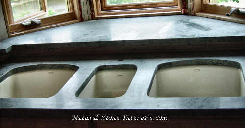 This granite kitchen picture highlights the attention to details in fabricating this honed granite top. See how perfectly the odd shaped raised window ledge is notched into the window area? There are three separate under hung cast iron sinks. These sinks are extremely heavy and ALWAYS need additional supports. Tricky to do... some installers won't even install cast iron sinks because of the weight. But, it's definitely doable.